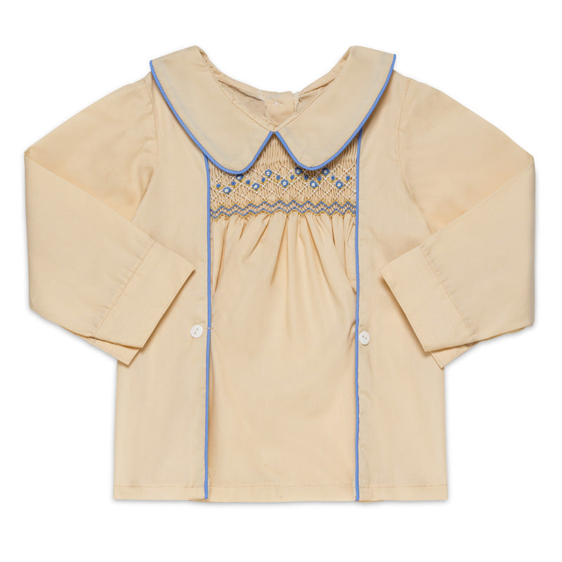 BOYS TRADITIONAL CREAM & BLUE HAND SMOCKED BUSTER SUIT BY . MADE IN SOFT COTTON BLEND, THE LONGSLEEVED TOP IS BEAUTIFULLY EMBROIDERED IN BLUE AND HAS MATCHING COLOURED PIPING ALONG THE EDGES. IT FASTENS ONTO THE SHORTS WITH BUTTONS FOR A NEATLY TUCKED-IN LOOK. THE BLUE COTTON BLEND SHORTS ARE FULLY LINED AND ARE PART ELASTICATED AT THE BACK. IT HAS LITTLE BUTTONS TO FASTEN ON THE BACK WHICH MAKE THIS ADORABLE LITTLE OUTFIT PERFECT FOR ANY SPECIAL OCCASIONS.