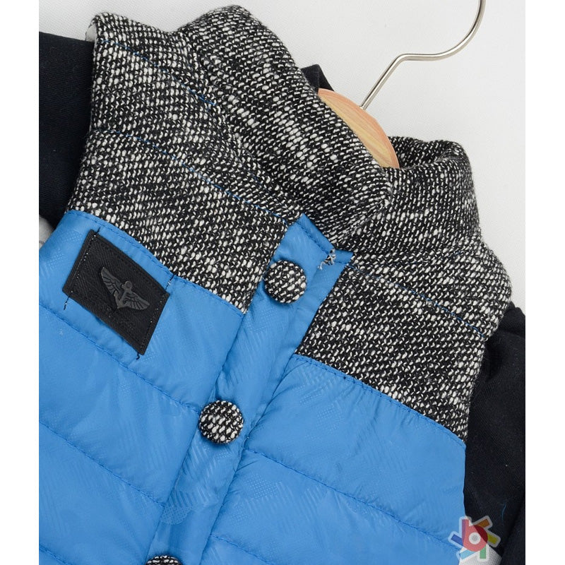 A super cosy outfit for baby boys. Gilet: a puffer style, made in smooth, blue polyamide with luxurious padding for extra warmth, poppers fastening. Top: Long Sleeves, 100%cotton, Trousers: Cotton Blend, Elasticated Waistband.