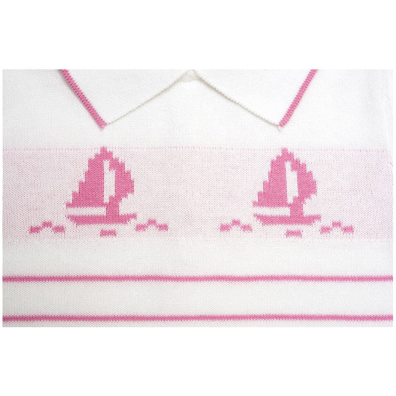 WHITE ROMPER-STYLE BABYGROW WITH PINK TRIM. THIS SOFT, FINE KNIT HAS A SMART COLLAR AND PINK STRIPED DESIGN. IT HAS TWO SAILING BOATS ON THE CHEST, POPPER FASTENING BETWEEN THE LEGS AND DOWN THE BACK.