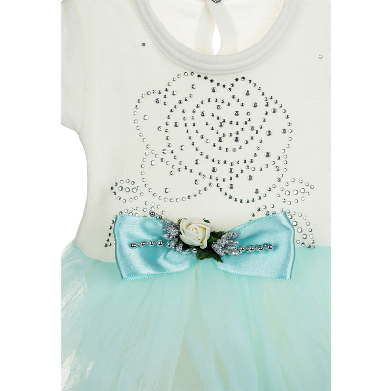 A ivory/aqua blue cotton dress for baby girls, made from soft, stretchy jersey with aqua blue tulle trims. This sweet dress has short sleeves and a useful integrated body vest. It has pretty diamanté flower on the front and fastens with poppers on the back and underneath.