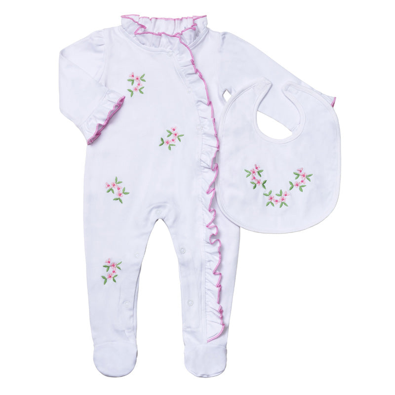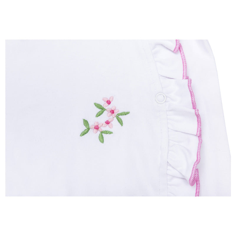 A beautiful white babygrow and bib set , made in super soft Pima cotton. It has pink edged frills around the seams and pretty flowers embroidered on the front.
