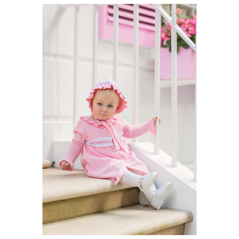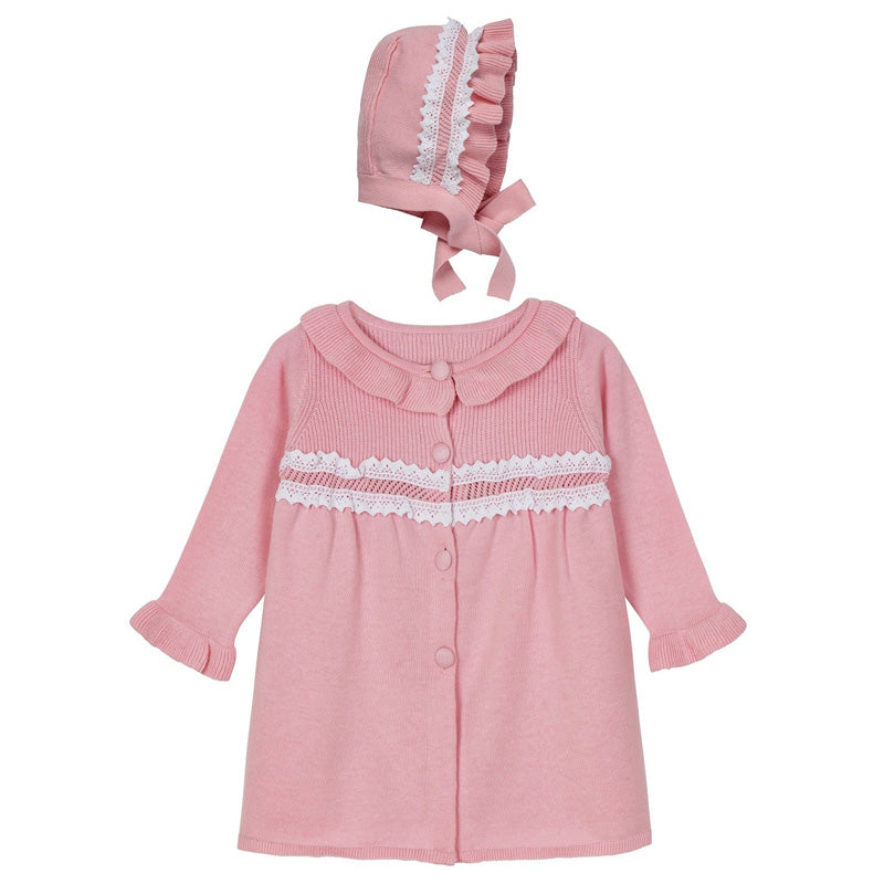 Pretty and practical, with a traditional look, this pink pram coat is in a fine knit and has a matching bonnet, so little ones can be coasy and cute at the same time. The variety of knitting styles, covered buttons, lace embellishment, ruffles on the cuffs and bonnet, all add to the outfit's charm.