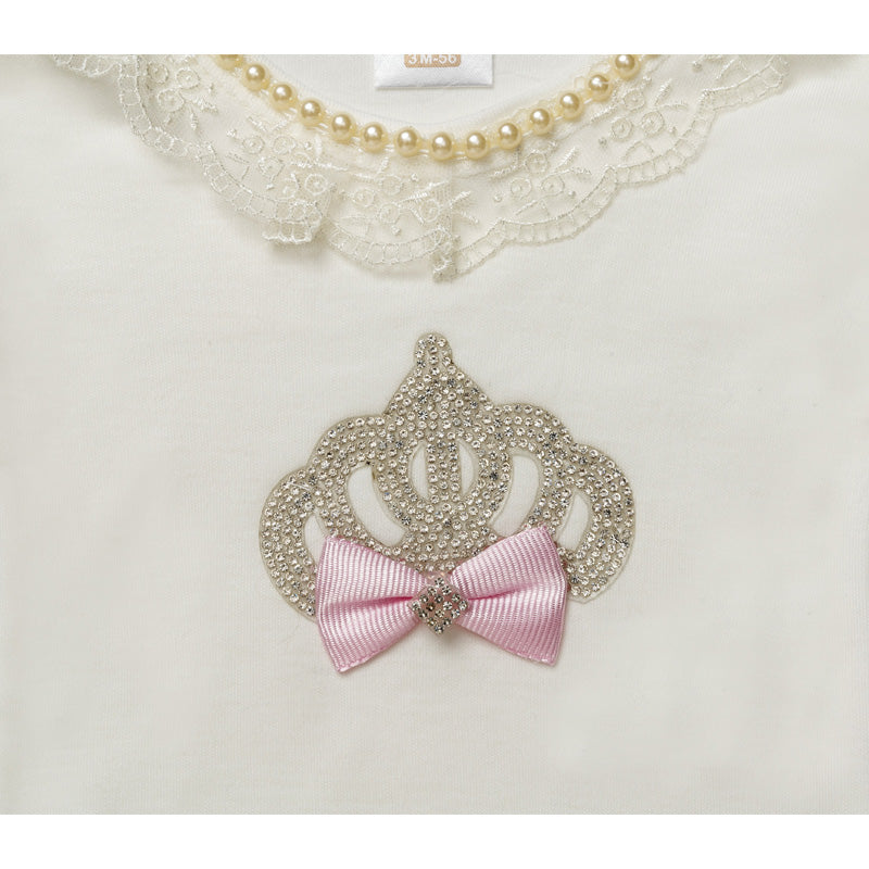 A gorgeous ivory jersey bodyvest, tulle skirt and headband outfit for younger girls. There is a sparkly crown motif with cute pink bow detail, pearls and lace embellishment on the front of bodyvest. Lovely little tulle skirt has wide elasticated waistband for comfort and soft matching baby headband makes this outfit perfect for any special occasions.