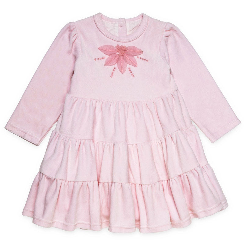 GORGEOUS PINK DRESS MADE IN SOFT AND SILKY VELOUR WITH WHITE COTTON LINING. IN A LONG SLEEVED STYLE, WITH PRETTY BUTTONS FASTENING AT THE BACK, IT IS FEAUTURES A LAYERED BOTTOM OF THE DRESS AND BEAUTIFULLY EMBROIDERED FLOWER AT THE FRONT.