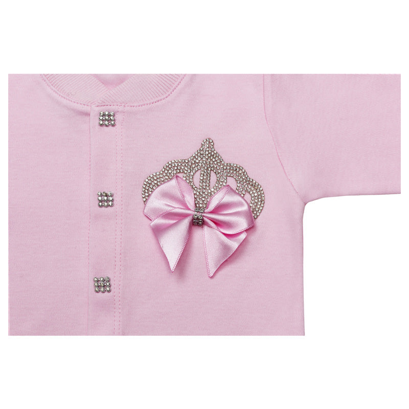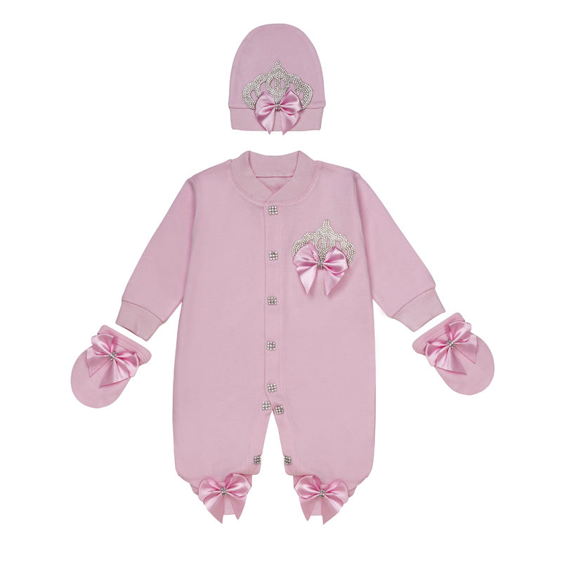 A charming gift set for baby girls, made in soft pink cotton jersey. The little hat and babygrow have sparkling diamanté crown decoration, front diamante popper fastening and cute satin bows on the mittens. This 3 piece set is gorgeous. Extra quality.