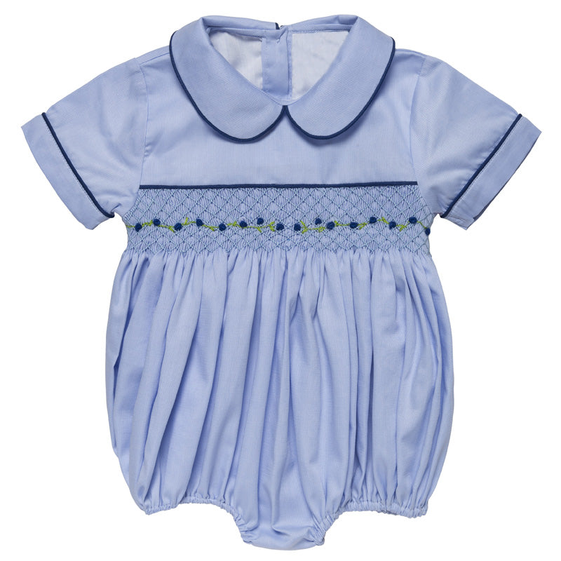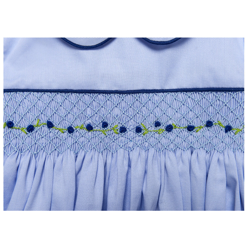 Traditional baby blue celebration romper. Short-sleeved, the front has a beautiful and contrasting navy blue embroidered hand-smocking that adds character to the outfit. Finished with a sweet Peter Pan collar and navy pipping details around the cuffs. Elasticated leg holes ensure comfort to your little one. Adorable outfit, perfect for special occasions. Combine with our bow socks to perfect the look.
