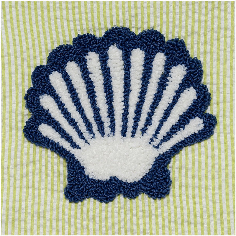 This sweet 100% seersucker cotton outfit has pale green & white stripes and bold blue Sea Shell hand embroidery( french knot) to create a charming, nostalgic style. With easy buttons at reverse, sleeveless design, elastic-waist shorts and ruffle trim to please frill-loving little ladies, this darling duo is comfy and classic.