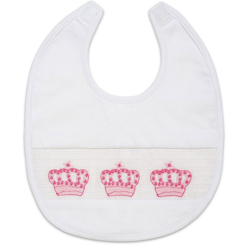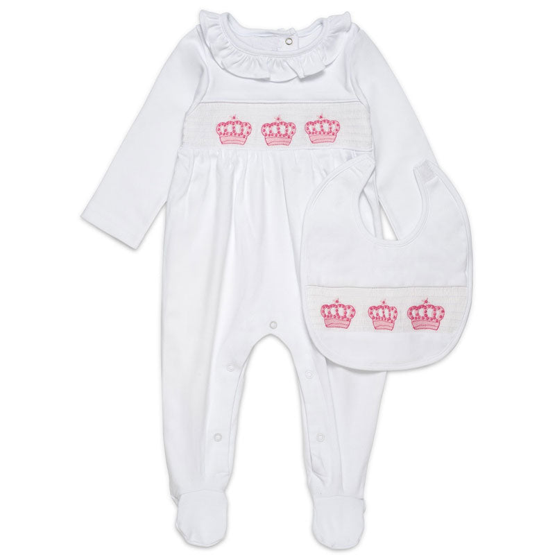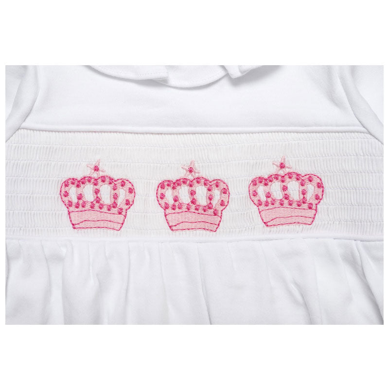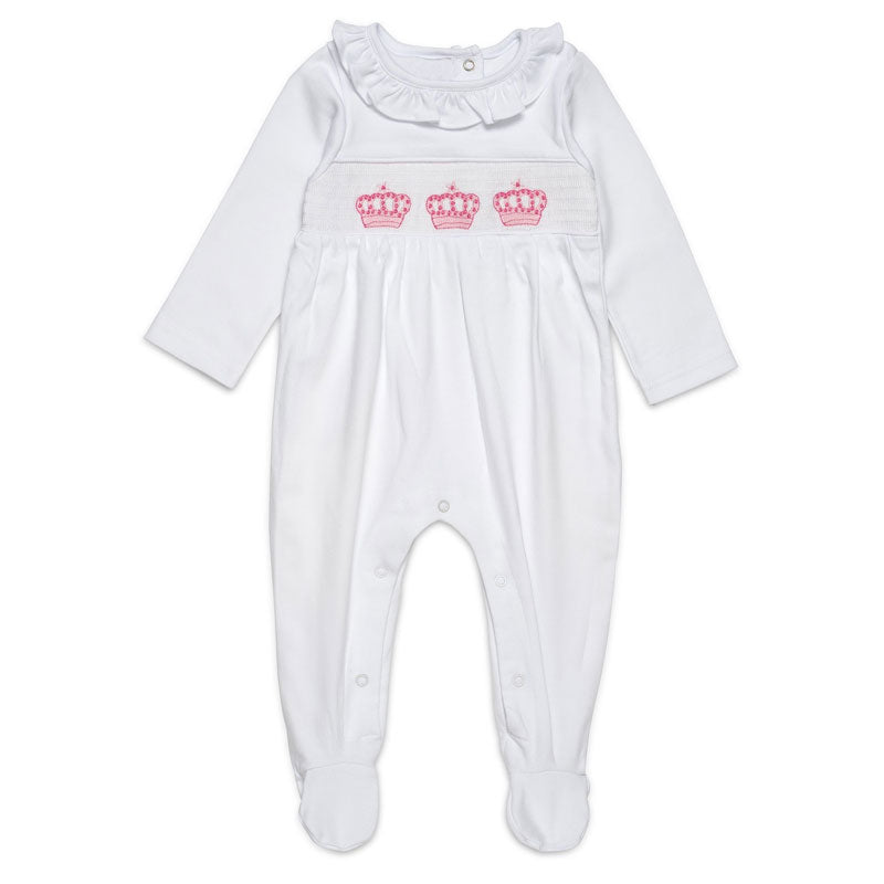 Baby girls adorable, white babygrow. Made from a soft textured pima cotton jersey, with a ruffle neck line. It has pretty hand smocking across the front, with embroidered pink crowns. In a baggy style, it fastens with poppers on the back and between the legs. 100% pima cotton (soft jersey feel) Machine wash (40*C) Style name: 'Princess Crown' Hand smoked Popper fastenings on the back and between the legs
