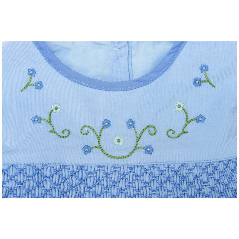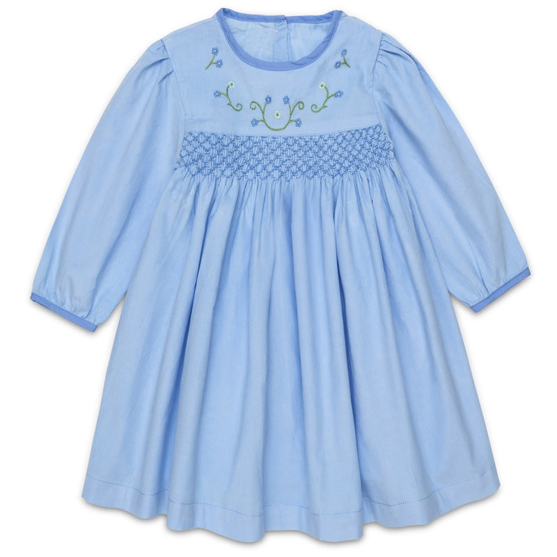 GIRLS ADORABLE, BLUE, HAND-SMOCKED "BLUE BELL" DRESS. THIS SOFT CORDUROY DRESS HAS BEAUTIFUL HAND-SMOCKING AND HAND-EMBROIDERY IN BLUE AND GREEN. THE ROUND NECK AND CUFFS BEING EDGED WITH A DARK BLUE TRIM.THERE IS A BACK BUTTON FASTENING AND IT IS FULLY BLUE COTTON LINED. A LOVELY,TRADITIONAL DRESS FOR ANY OCCASION.
