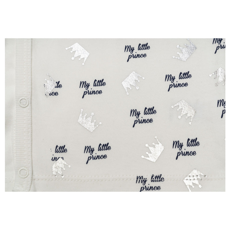 hese cute babysuit, embroidered bib and hat set made in soft cotton jersey, with a silver printed crowns and satin bow details.