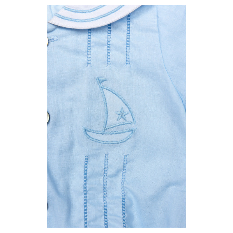 Who isn't in love with nautical baby rompers? This baby boy outfit is cute, classy, and full of nautical details! Features a sailor collar that folds over the back and matching detailing on the sleeve cuffs. The button down front is accented with rows of boring and sweet hand made embroidery of a sailboat and stars. Opens with buttons down the front and snaps at the crotch for easy on-and-off changing convenience. A suit so cute, classy, and convenient, how can you say no?