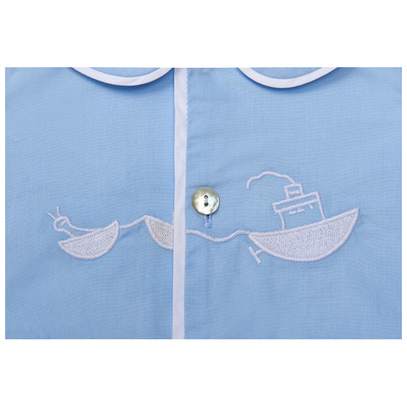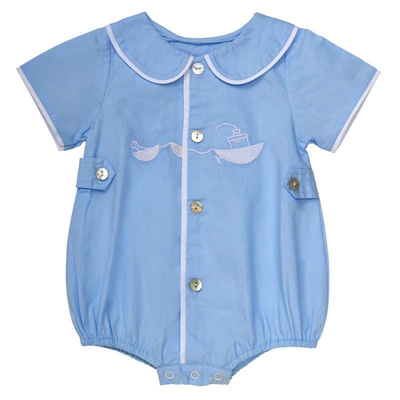 "Row, row, row your boat..." This precious little suit will look absolutely adorable on your little prince! Features contrasting borders on the cuffs, and fastened to the collar. Sweet shadow stitching of a tug boat graces the center, above dainty waist tabs that add a classy look. Were you looking for an outfit for your baby boy that's cute, classy, and unique? You've just met your match!