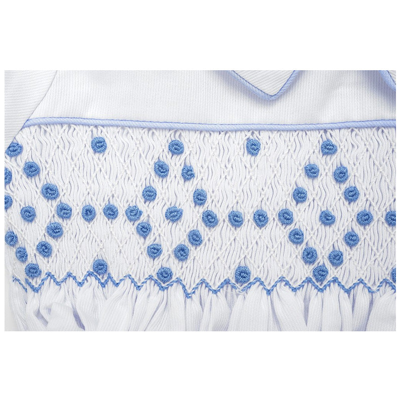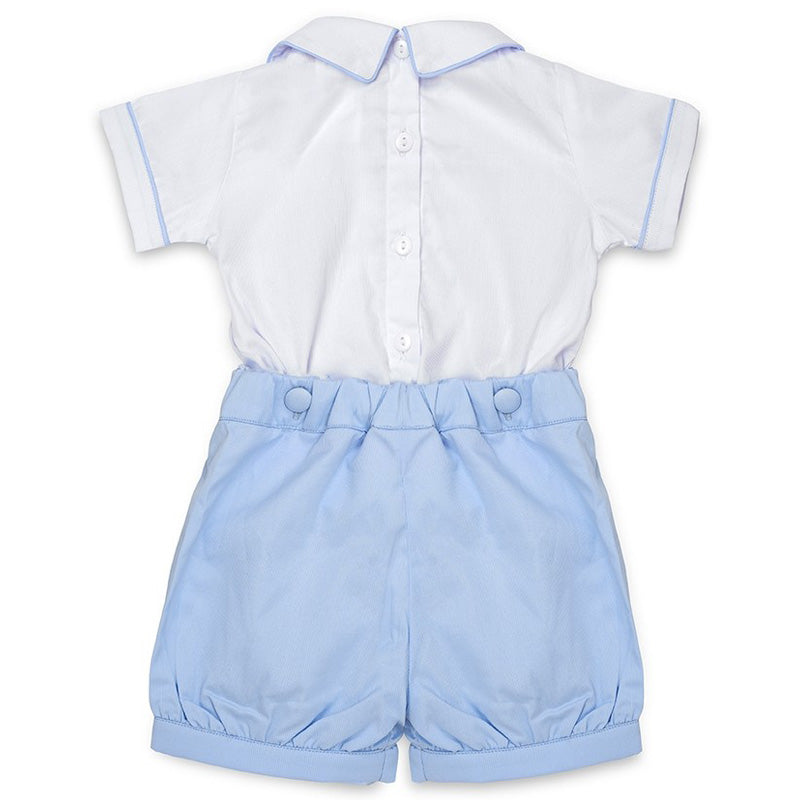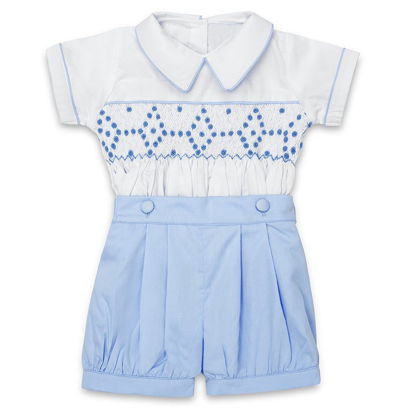 Smart outfit for little boys, with beautiful hand-smocking on the shirt. The blue shorts are elasticated for comfort, and can be fastened on to the shirt with buttons for a neat, tucked-in look.