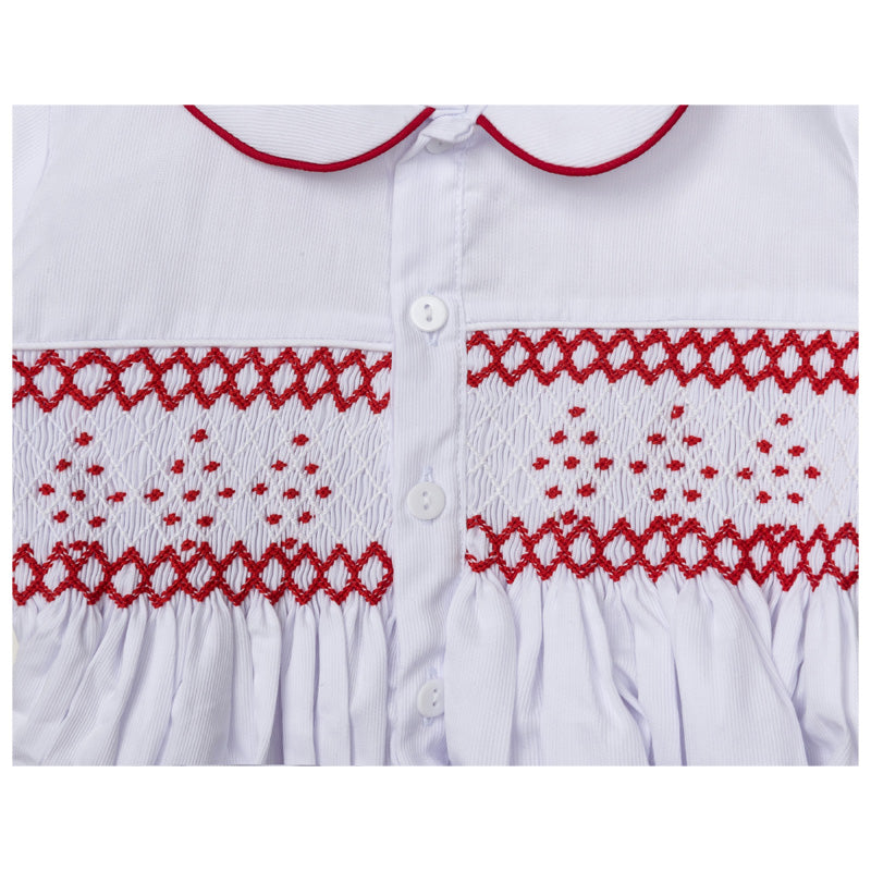 This adorable white and red suit will always look smart on your little boy, as the top cleverly buttons to the shorts for a neatly tucked in look. For a traditional look, the top has been carefully hand-smocked with brown embroidery to coordinate perfectly with the shorts. Wearing this outfit your little one will be just like Prince!!