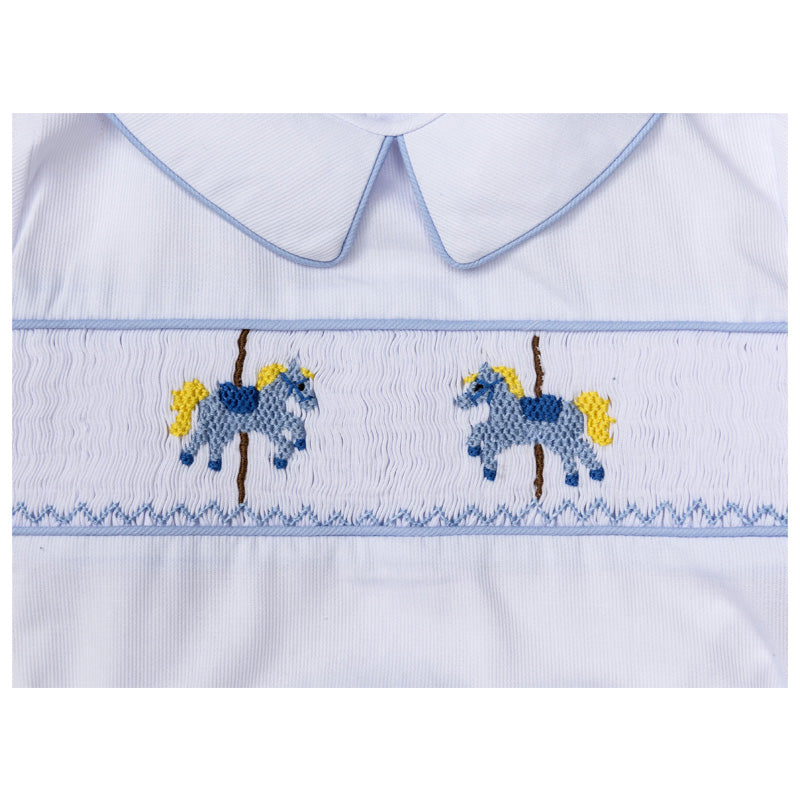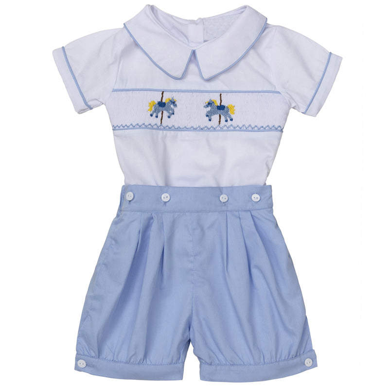 This adorable white and blue suit will always look smart on your little boy, as the top cleverly buttons to the shorts for a neatly tucked in look. For a traditional look, the top has been carefully hand-smocked with brown embroidery to coordinate perfectly with the shorts. Wearing this outfit your little one will be just like Prince!!
