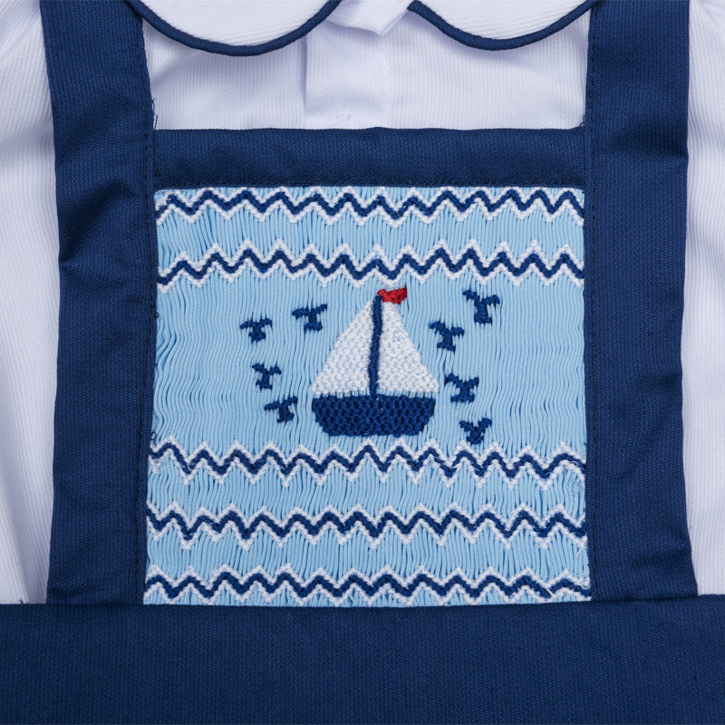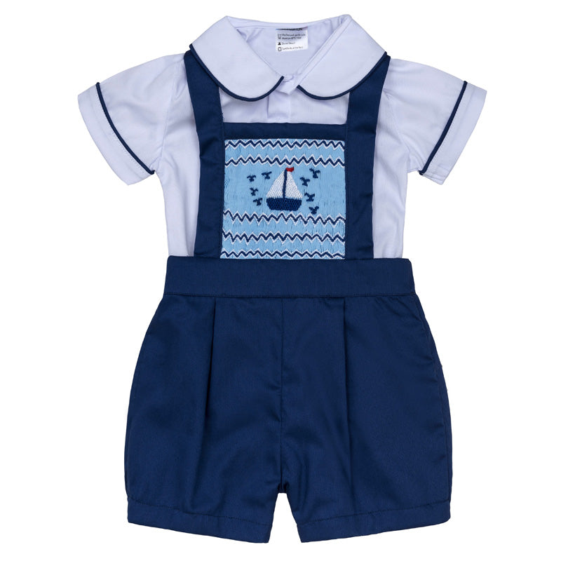 These dungarees are an adorable choice for little boys, in a navy blue cotton, with a Sailboat hand smocked design on the front panel, an elasticated back-waist and fully lined in cotton. They come with a white traditional shirt, made in cotton piqué with navy blue pipping on collar and cuffs.
