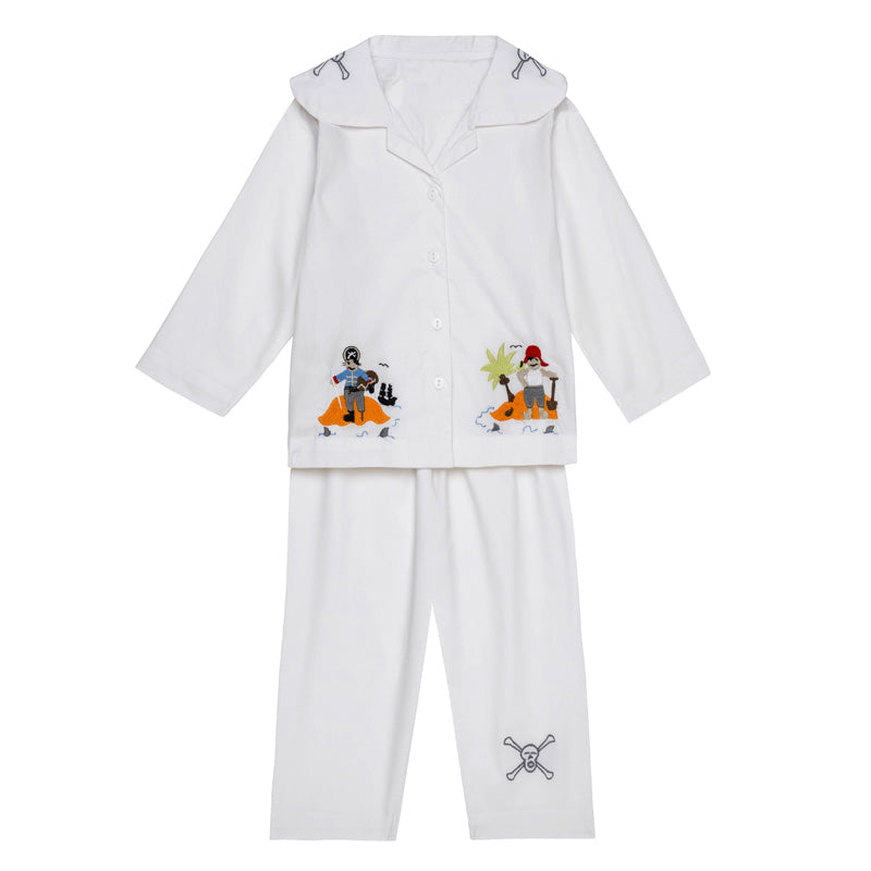Boys white traditional style pyjamas made in lightweight cotton poplin with a softly woven feel. The top fastens with front buttons and the trousers have a comfortable elasticated waist . Fun to wear, with colourful embroidered 'Pirates' and light grey skull and crossbones.