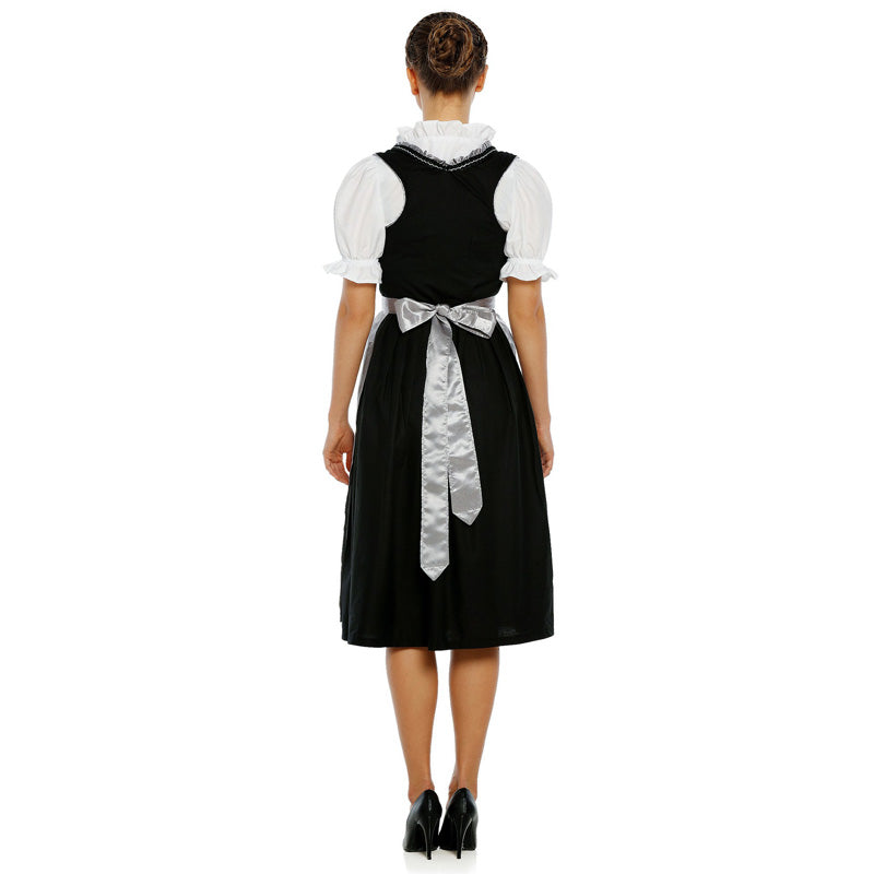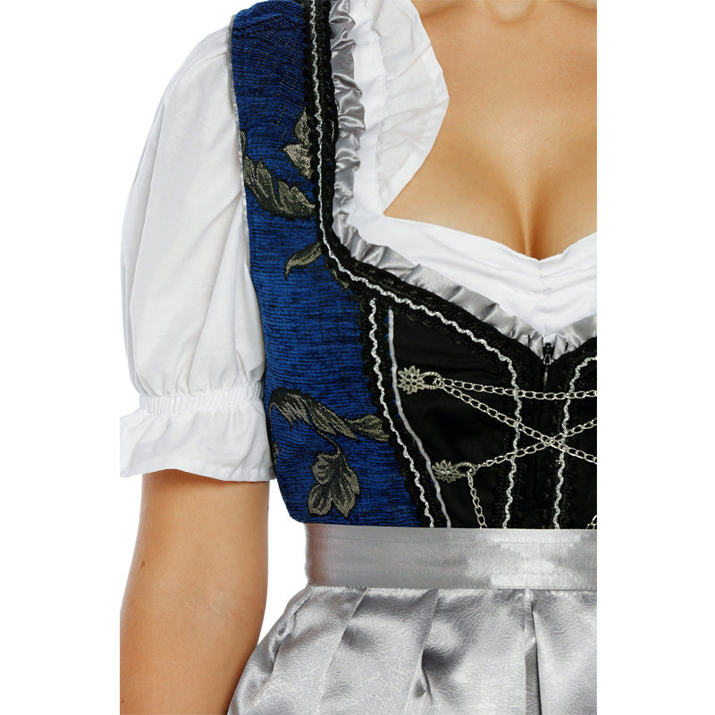 The natural embroidery on blue velvet fabric are perfectly successful. The contrast is beautiful. The eye-catcher completes the structured, silver apron perfectly.