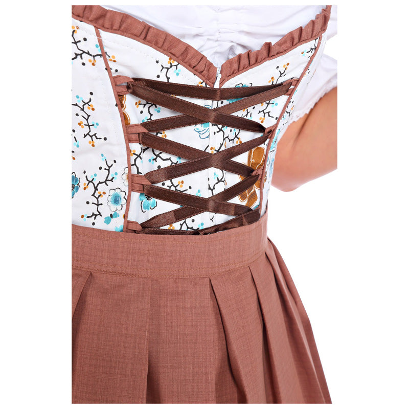 In this dirndl, the floral and tendril patterns were effectively combined. A feast for every occasion and age group. The white blouse has puffed sleeves and a lace trim.