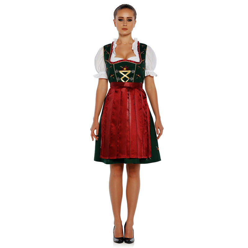 The Edelweiss embroideries on traditional green fabric look traditional. The eye-catcher completes the structured, red apron perfectly.