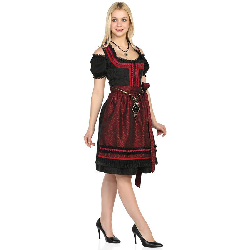 Dirndl, apron and blouse Size:  36, 38, 40, 42, 44, 46, 48, 50, 52 Length: 100 cm Skirt length  65 cm (Midi) Material: Top : 100% polyester Underskirt: 100% polyester, Blouse: 100% Cotton Apron: Polyester Color: Shell: Black / Bordeaux / Red Underskirt: Black / Bordeaux / Red Blouse: White Apron: Black / Bordeaux / Red