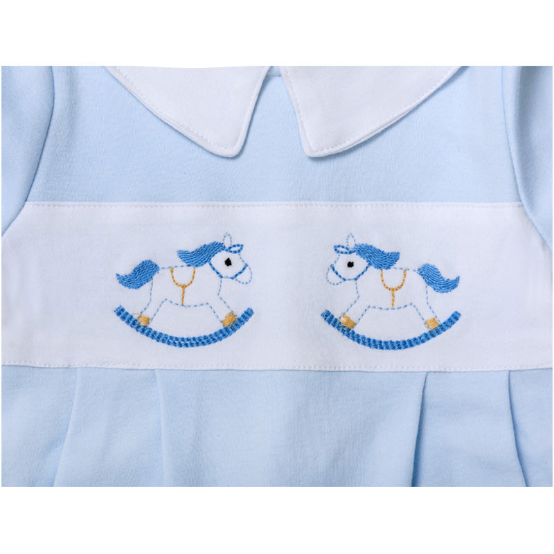 A sweet, classy babygrow@bib set for your little one, this beautiful outfit is sure to please the discerning eye. The Rocking Horse Babygrow made of soft pima cotton in blue with an adorable embroidered rocking horse in the center. A totally precious piece for your loved one, and it even has a matching bib! Sure to become an instant family favorite from the first time Baby wears it.