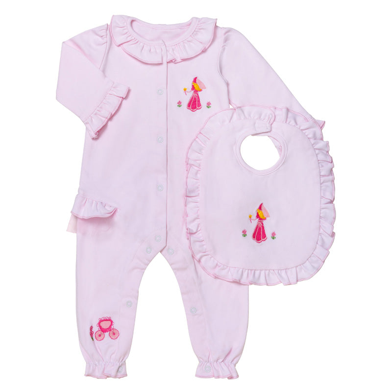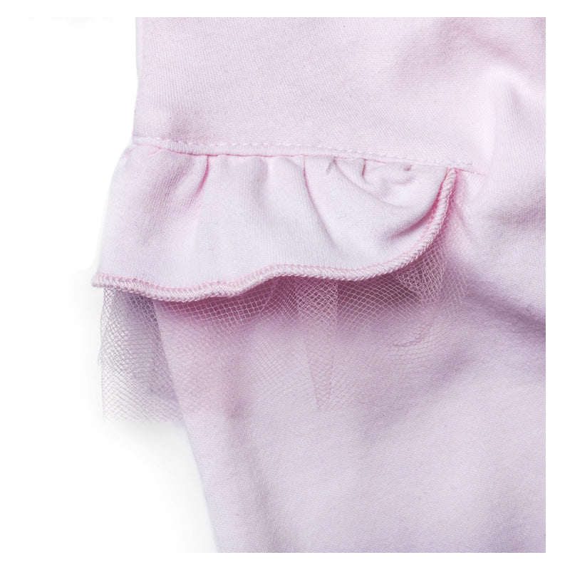 Pink Pima cotton jersey babygrow for baby girls, it feels super soft and comfortable against the delicate skin. It has ruffle trims around the neck and cuffs and also on the hips with tulle detail. It also has a cute fairy and carriage embroidery detail on the front.