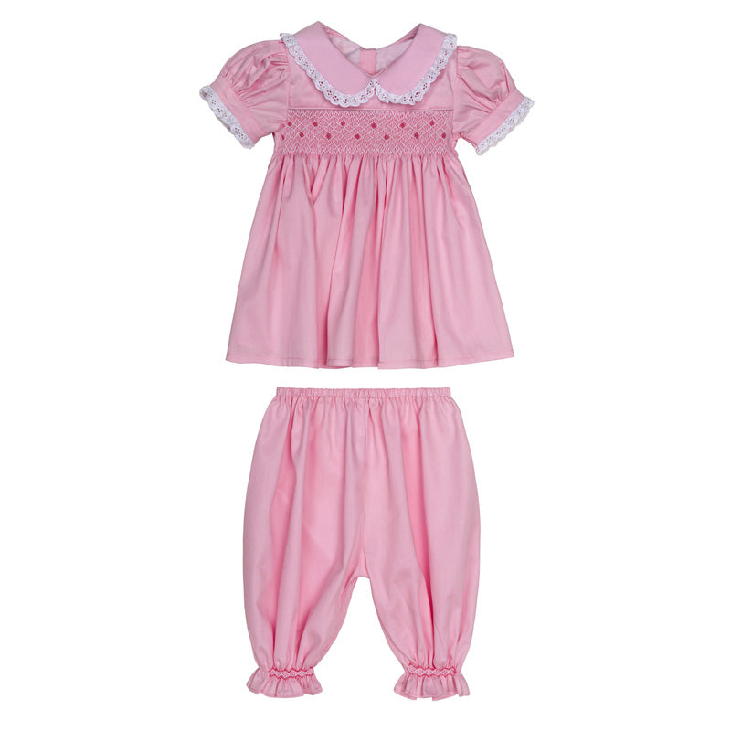 Girls traditional pink cotton hand-smocked pyjamas with a comfortable elasticated waist. The pyjamas have beautiful hand-smocking at the chest, and leg cuffs with hand- embroidery. A charming round collar with lace on the edges and on the cuffs are additional special details. Back buttons fastening.