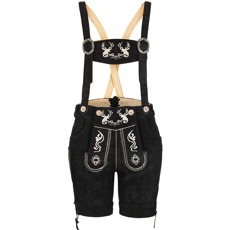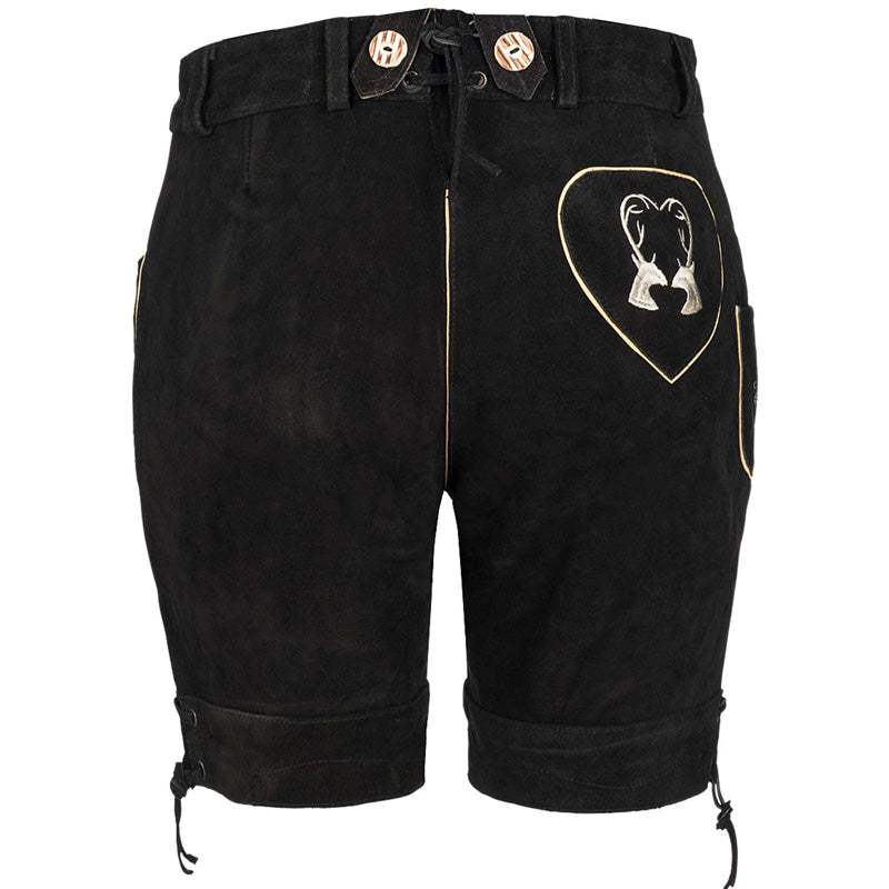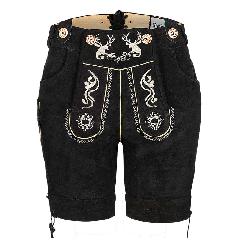 Attractive short ladies leather pants made of beautiful suede leather with traditional flora fauna embroidery, black