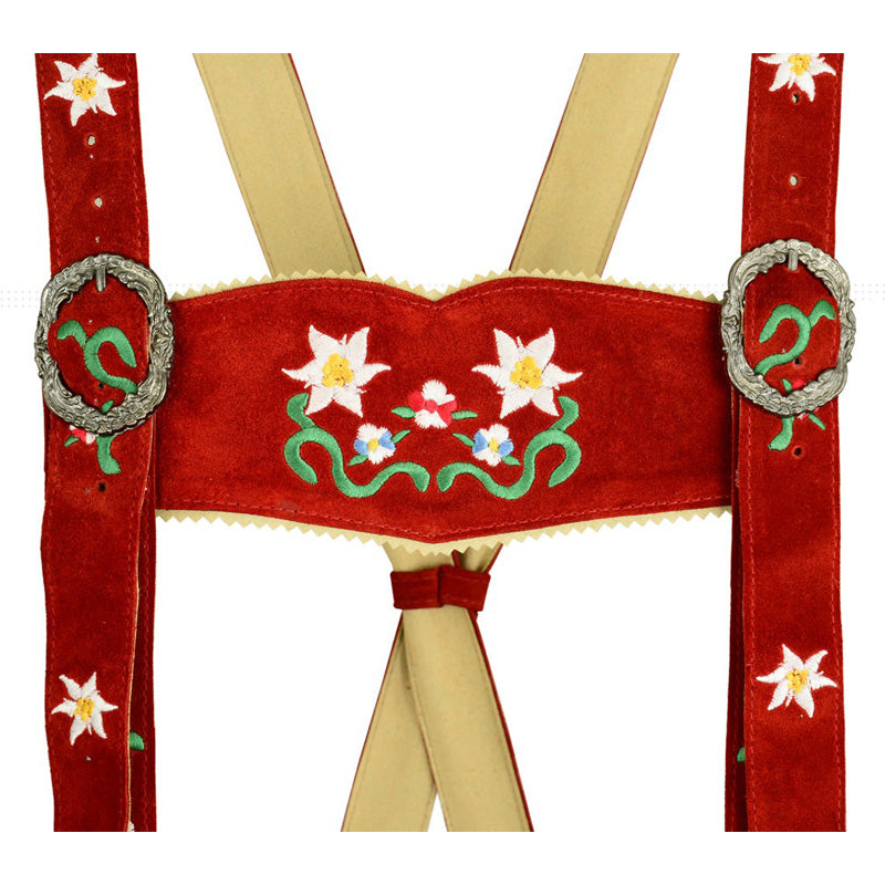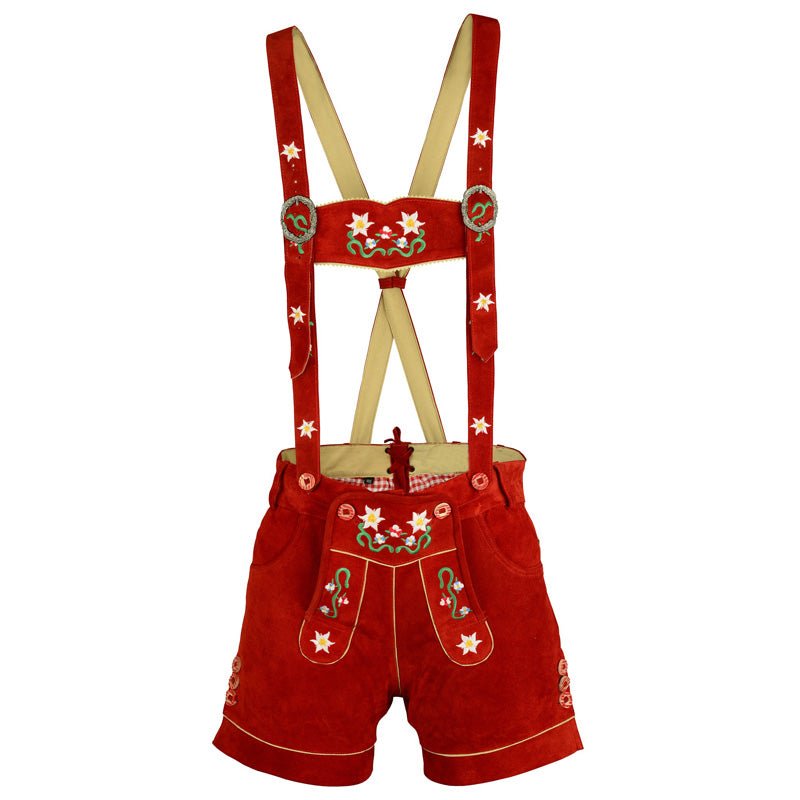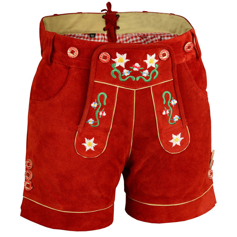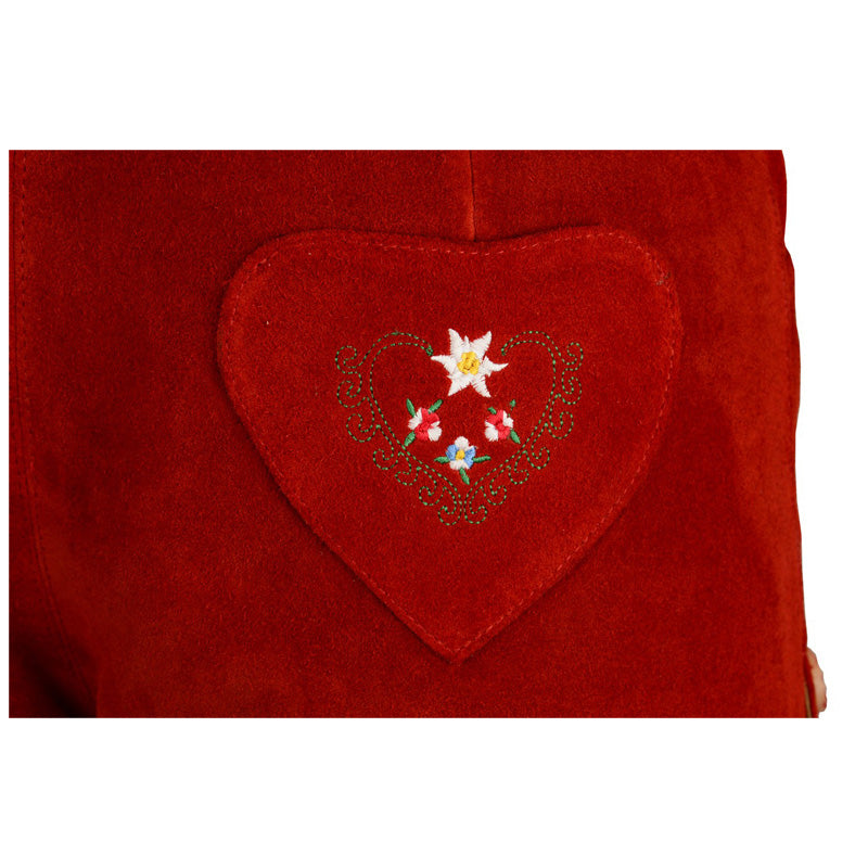 Ladies traditional Lederhosen short made of fine cowhide leather with floral embroidery and heart pocket, red