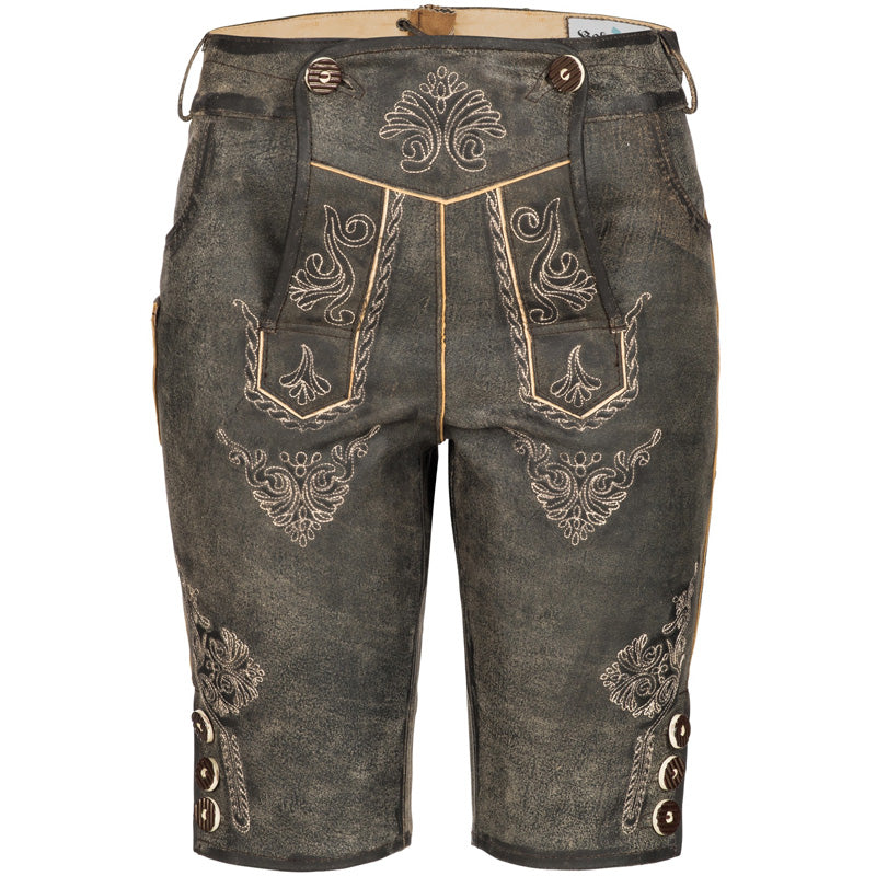 The vintage look, the classic motifs of the bead embroidery and the buttons in deer horn optics on the legs and at the bib give the attractive leather trousers for women an unmistakable, traditional look
