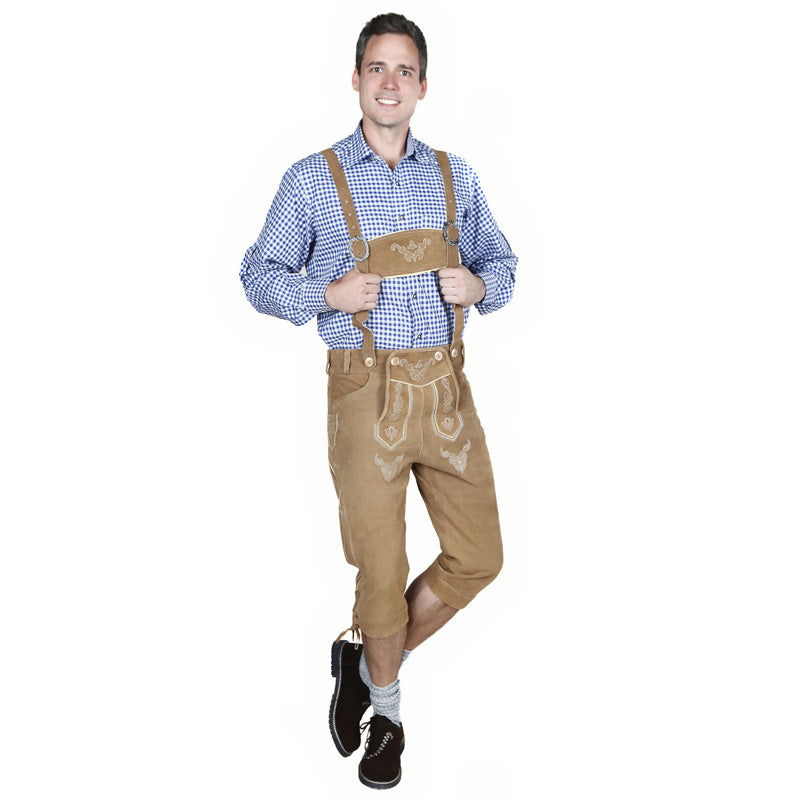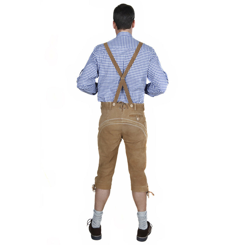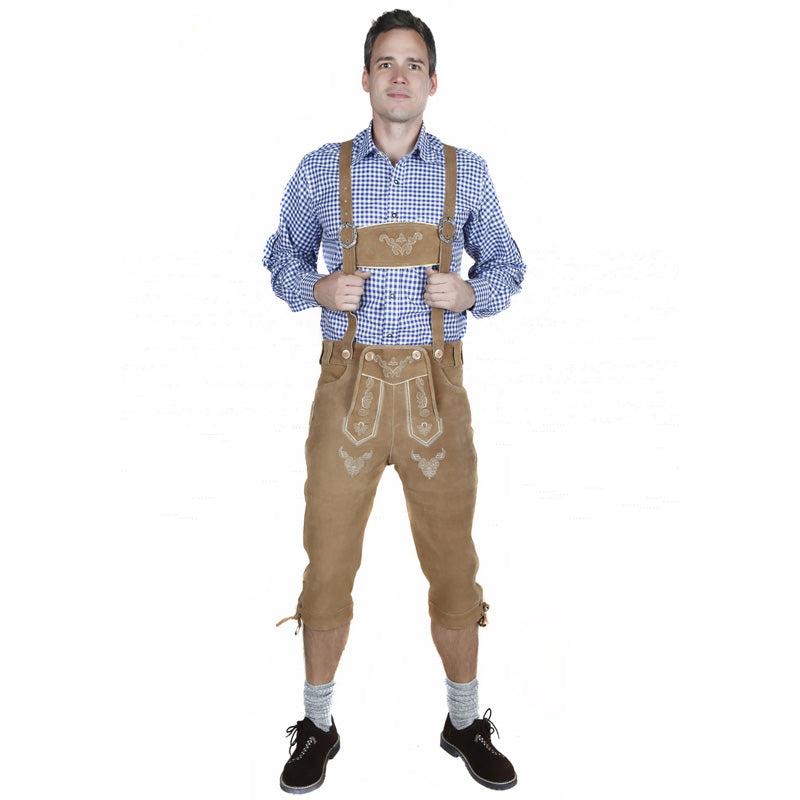 You will not only look good at the Oktoberfest in this hearty suede trousers made of soft velor leather. The bridge of the suspenders and bib adorn decorative yet subtle embroidery. The bib is closed with 2 traditional buttons. The bridge straps are removable, so you can also wear the Kniebund leather pants with a belt. The pants have 2 side pockets, a back pocket and a knife pocket. Waistband and cuffs are adjustable with leather straps.