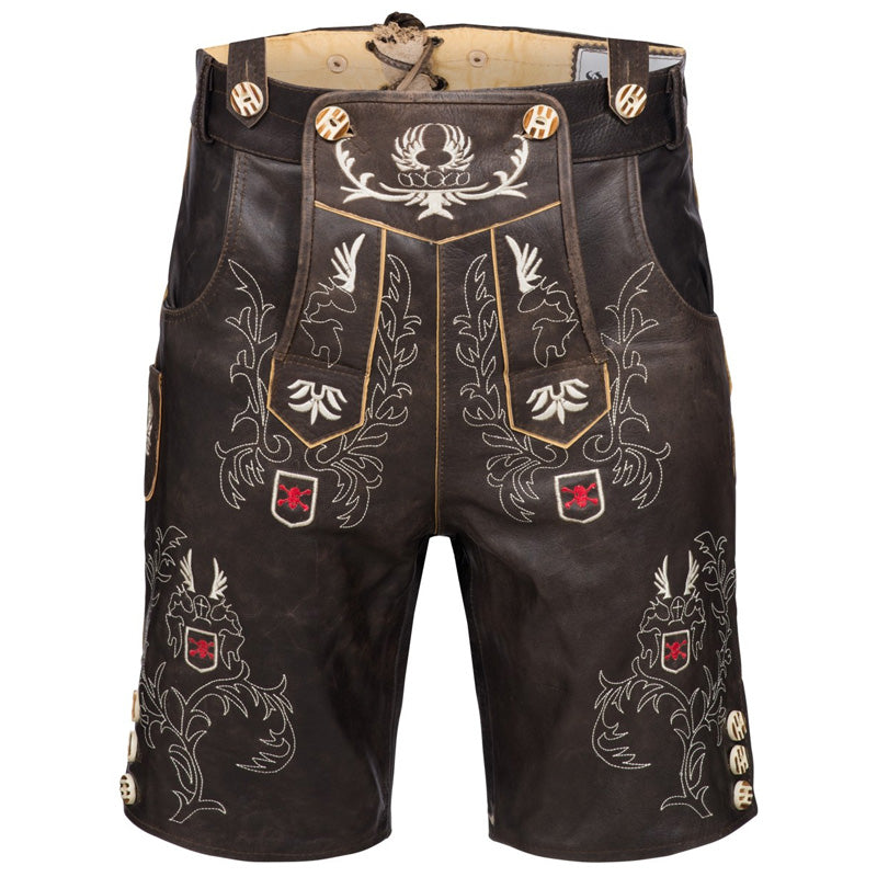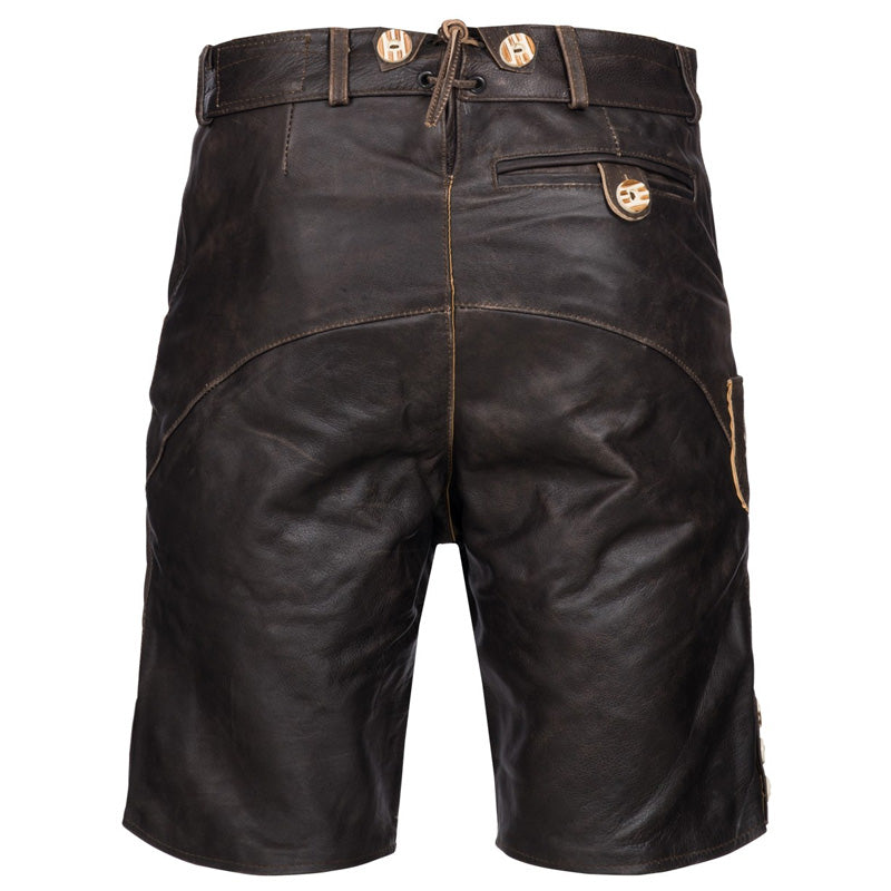 A valuable short leather trousers in rustic antique brown, which is a real eye-catcher.