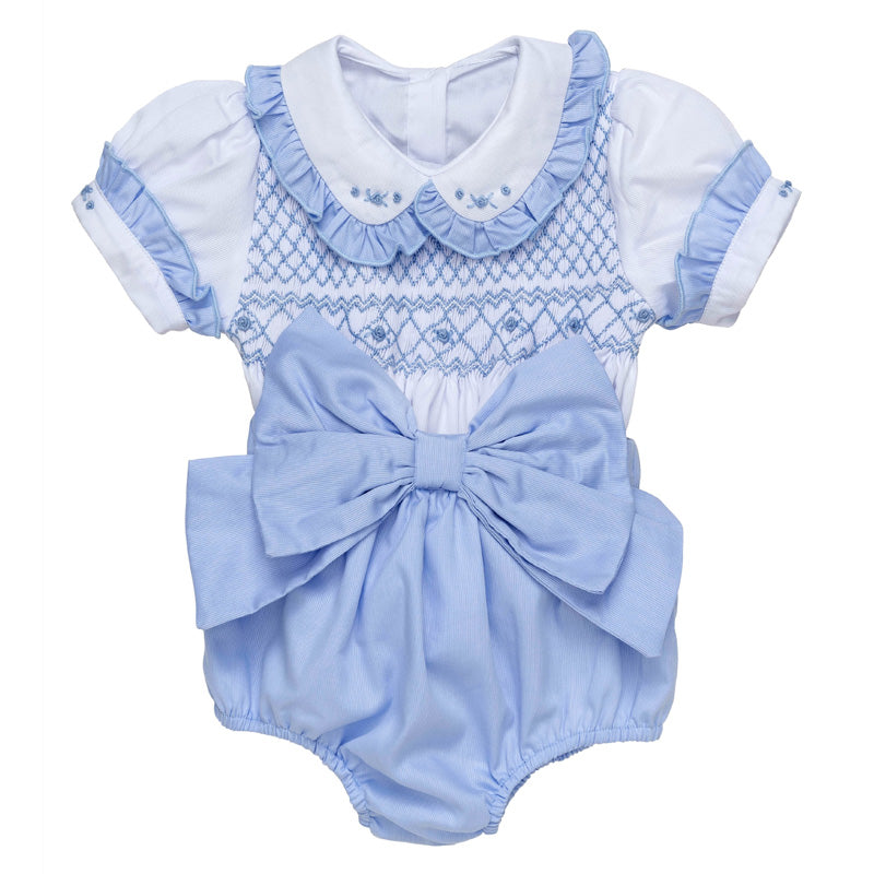 A traditional buster suit for girls. This soft blue and white outfit includes a hand smocked blouse which fastens to the shorts with small buttons helping baby keep neat and tidy. The soft cotton pique fabric shorts have a partially elasticated waistband for comfort and there is a pretty matching bow at the front.