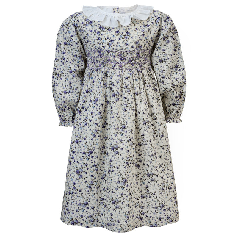 This traditional dress is made of soft cotton and cut from an elegant beige and lilac floral pattern fabric. 3/4 length sleeves that finish in gathered elasticated cuffs and a white contrasting sash that ties in a large bow at the back. A frilly white collar and hand-smocking panel on the front adds to the delicateness of the fully lined dress. A must-have in any girl’s wardrobe, it’s a perfect item for smart events for any seasons season.
