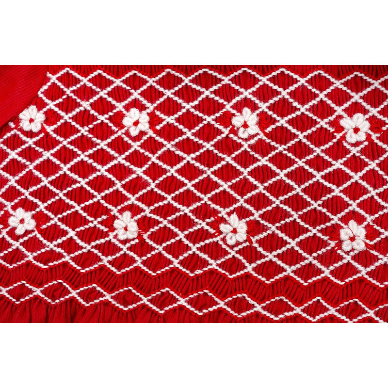 Pique Cotton red dress. This beautiful design has a hand-smocked fitted bodice with hand-embroidered ivory roses. There are pretty puff sleeves, white peter pan embroidered collar and it does up at the back with buttons and sash- bow.
