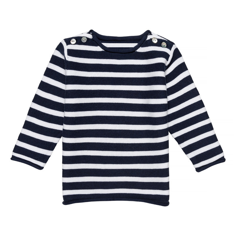 This smart and stylish Breton white and navy stripe sweater is a classic addition to a boy's wardrobe. Made in a soft cotton knit, this jumper has button fastening on the shoulders for easy dressing