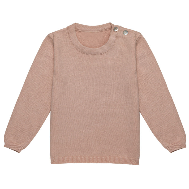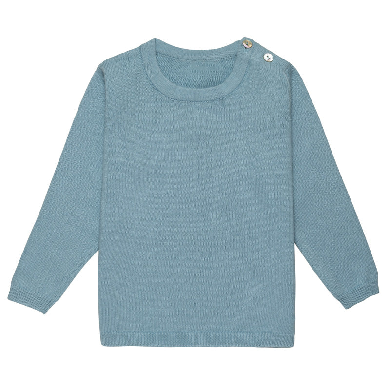 Lightweight and soft, these dusty blue and dusty pink sweaters is a great top layer for little ones. Made in a fine cotton/angora knit, it fastens with buttons on one shoulder for dressing.
