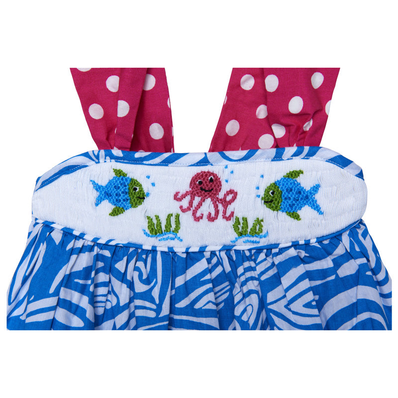 "Ocean Breeze" hand embroidered dress crafted from cool pure cotton and combined lovely blue&pink polka dots fabrics. Bold sea motif embroidery to create charming, nostalgic style. Dress is unlined with open back design.Adjustable straps on the shoulders. Polka-dot ruffle contrast hem and matching polka dot bow on reverse. Comfy and classic