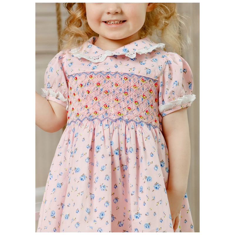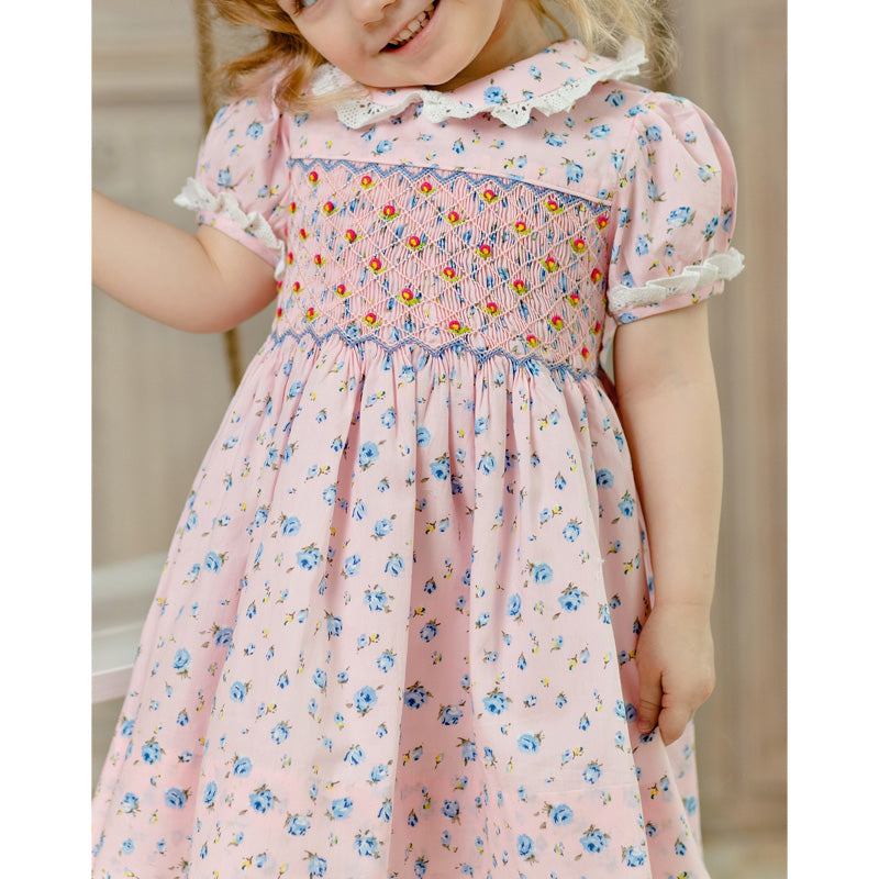 Classic, this traditional smocked dresses comes in pretty floral print and features a Peter Pan collar with lace edge. Made from a 100% cotton it comes fully lined with a matching self-tie bow at the back for the perfect finish.