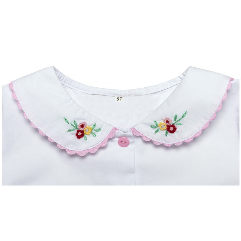 Every girl needs a white blouse and this design would be a perfect choice. Made in white cotton poplin, it feels soft and smooth against delicate skin and has a traditional, pink rickrack trim on the collar with lovely embroidered flowers. Pink buttons fasteners.