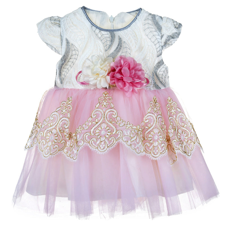 A beautiful luxury pink occasion dress, decorated with embroidered gold lace and flouncy layers of tulle. The attached flowers on the waist and lined in soft cotton. Back zip fastening.